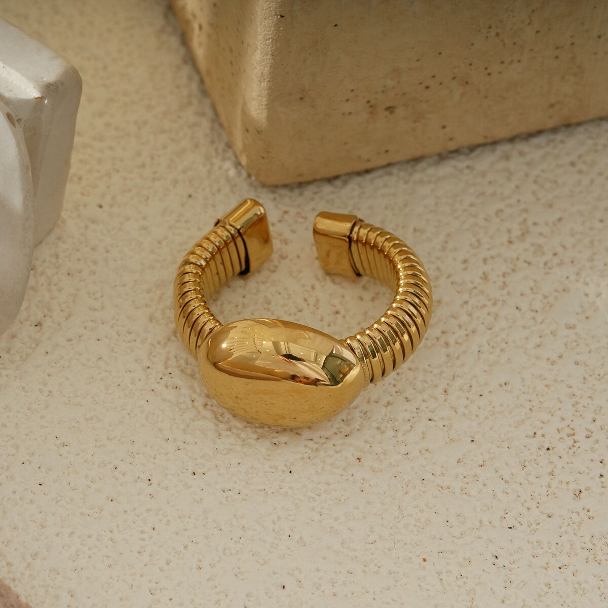 La Bague Flex est un modèle très original. Un anneau plutôt large, strié façon tube flexible. Ce bijou habille vos looks au quotidien, il est en acier inoxydable et vous est proposé doré.