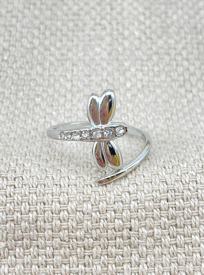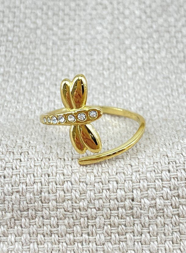 La Bague Odonata est un modèle fin, raffiné et originale. Elle est ouverte sur le dessus avec une libellule à l’extrémité ornée de strass. Une pièce lumineuse et intemporelle à porter au quotidien. Ce bijou est en acier inoxydable et vous est proposé argenté ou doré.