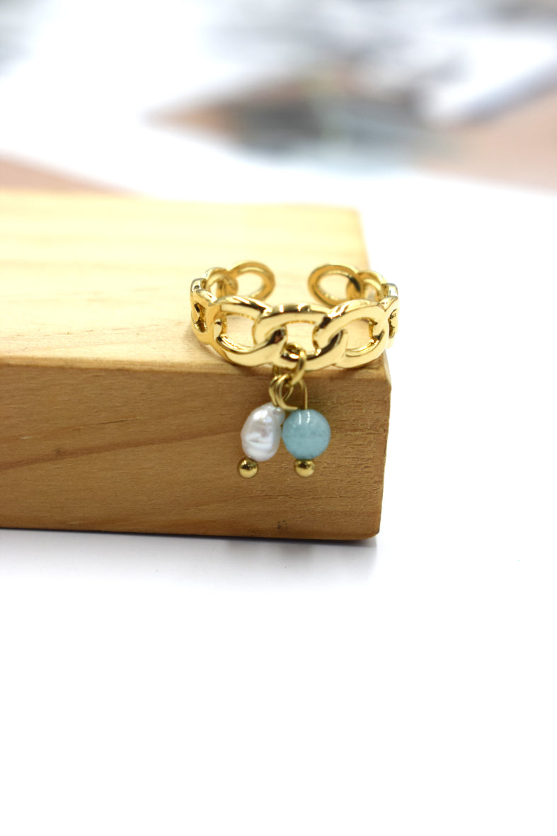 Bague Perles Dorée en Acier Inoxydable Pampilles vert d’eau et blanches