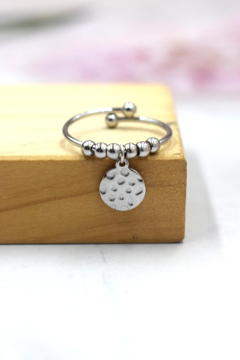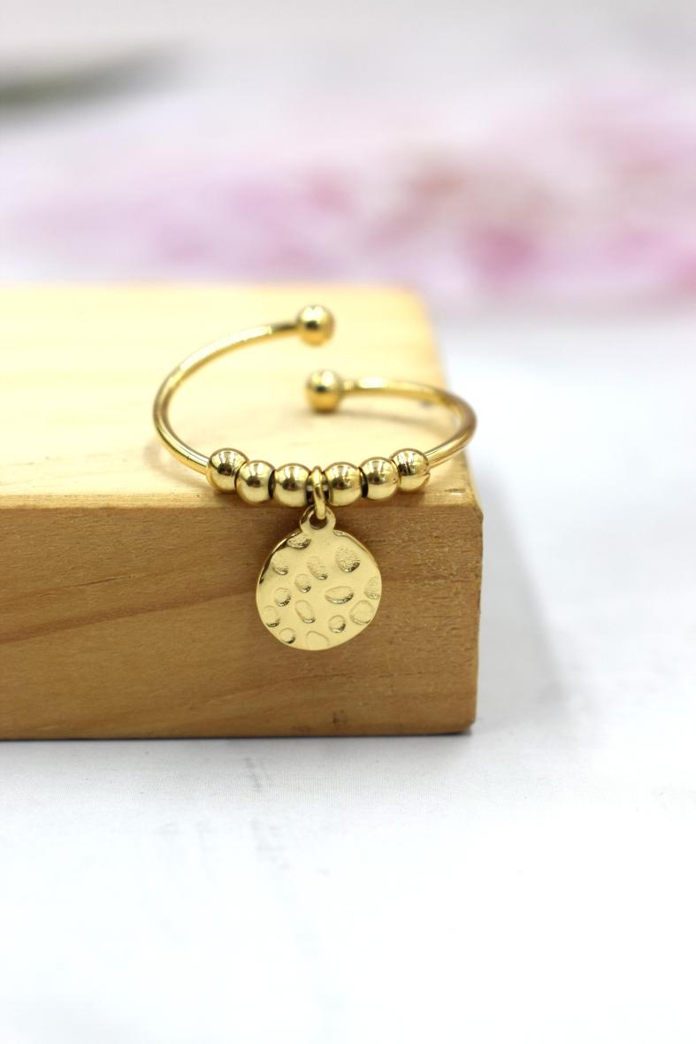 On adore ce modèle simple et original ! Un anneau orné de perles dorées et d’une breloque médaillon martelé ! S’ajoute facilement à d’autres anneaux fins au même doigt pour un effet ultra tendance ! Cette bague est en acier inoxydable, elle vous est proposée dorée ou argentée ! Ce bijou est ajustable !