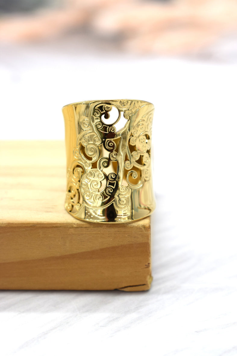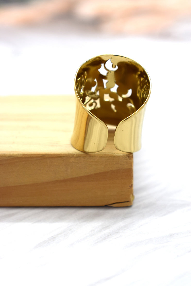 La Bague Shéhéra souffle un vent d’orient, elle est large et imposante. Un modèle qui a beaucoup de caractère. Ce bijou est en acier inoxydable et vous est proposé doré .