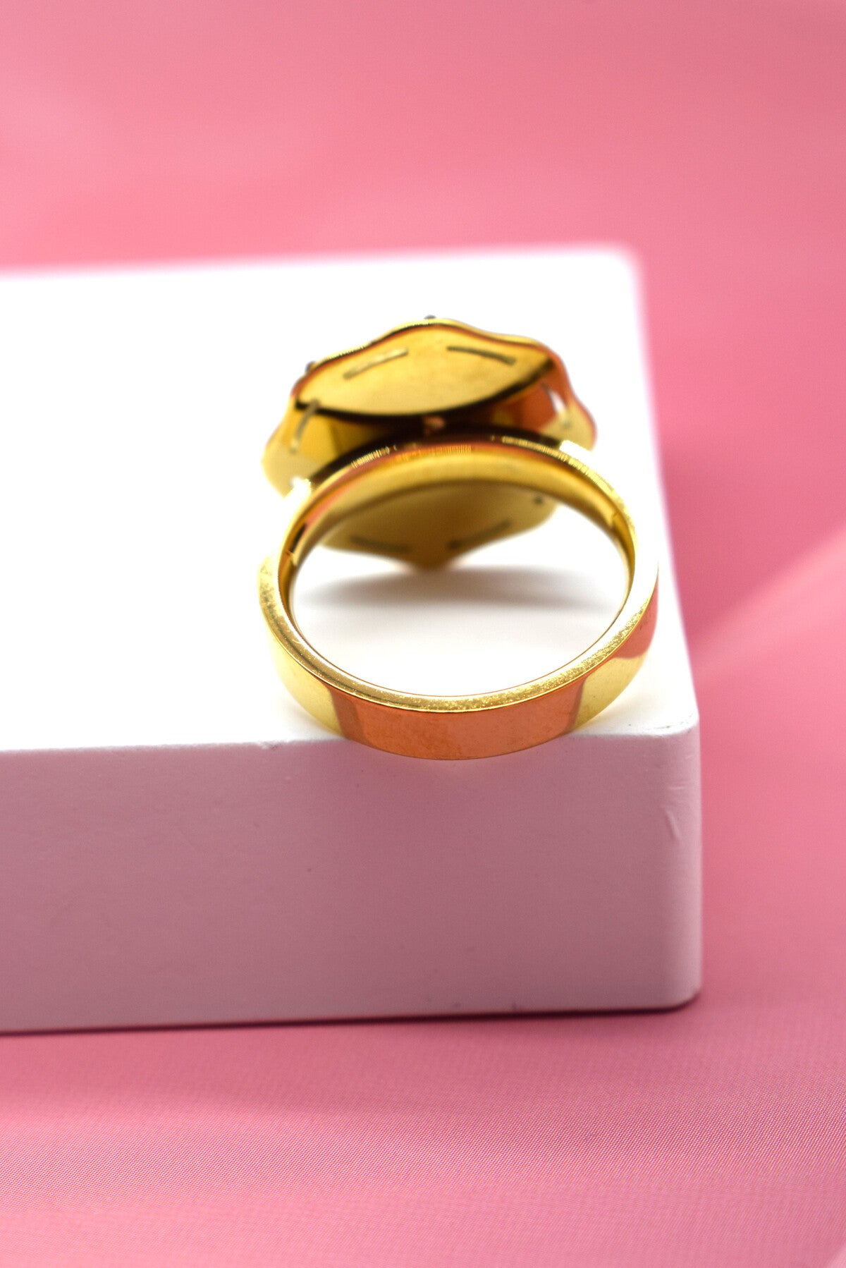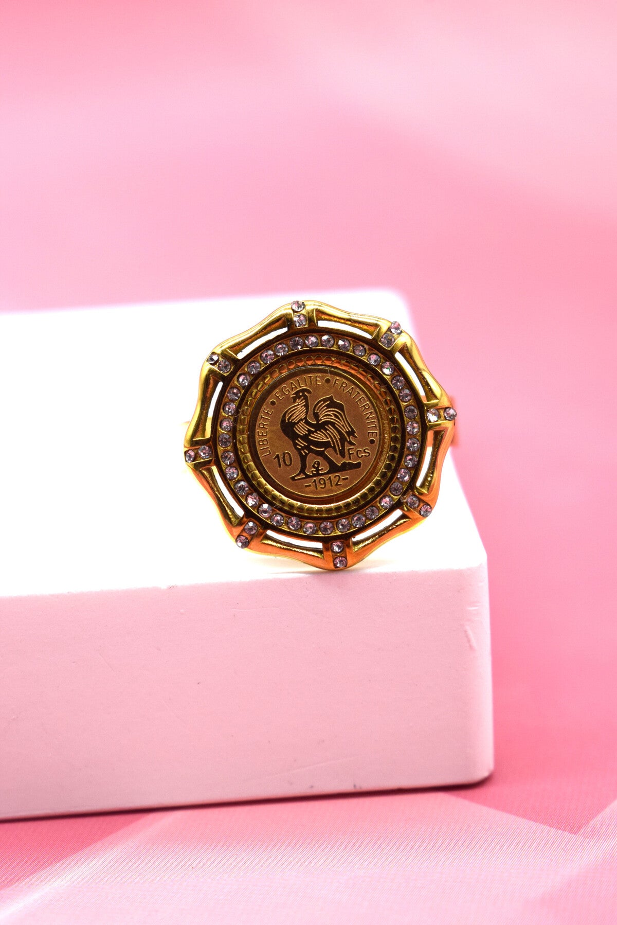 La Bague 1912, une touche rétro irresistible ! Une pièce de monnaie montée sur un anneau, elle est ornée de strass et cerclée. Ce bijou est en acier inoxydable et vous est proposé doré.
