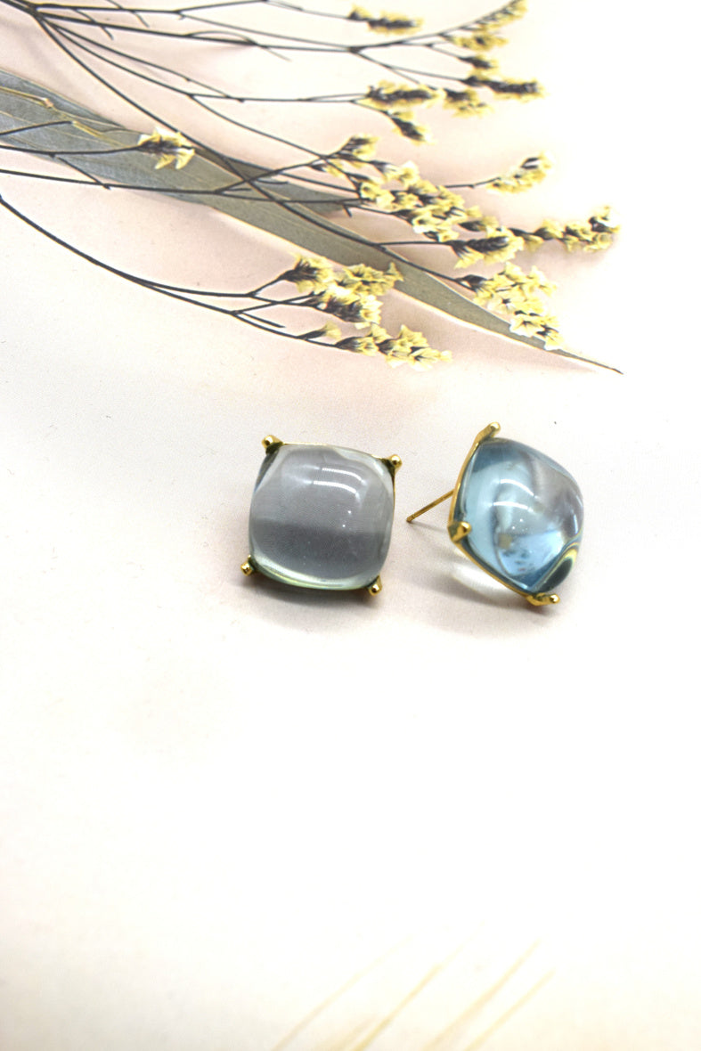 Les Boucles d’oreilles Béryl sont en résine, couleur vert transparent, ou bleu transparent et acier inoxydable doré. Une touche de lumière qui habille votre quotidien.