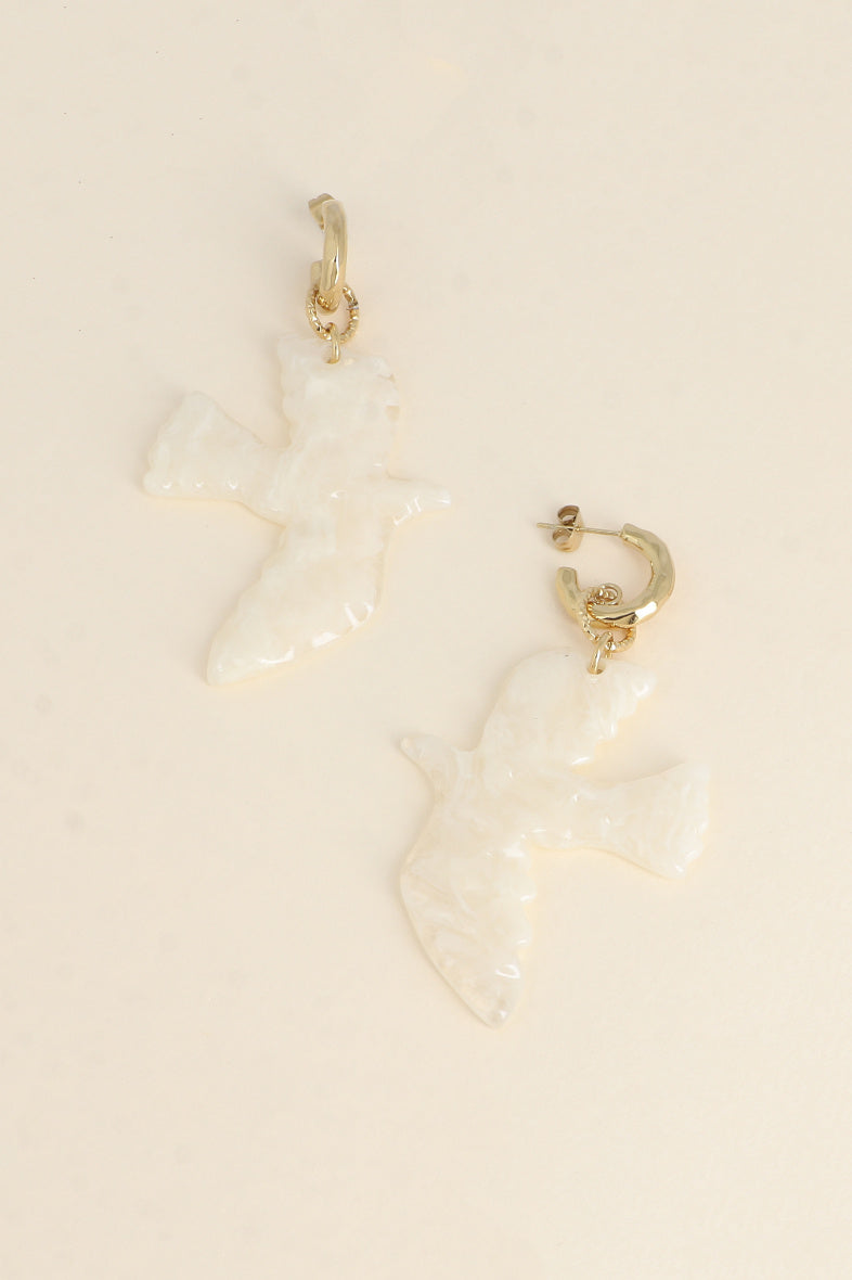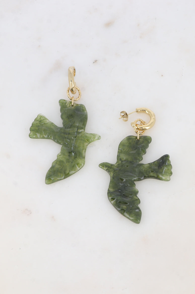 Les Boucles d'oreilles Bird sont un modèle magnifique ! Ce modèle, c ‘est une touche de poésie, de grâce et d’originalité pour tous vos looks. Elles sont en acier inoxydable et dorées. Elles vous sont proposées blanc-crème ou vert-kaki.