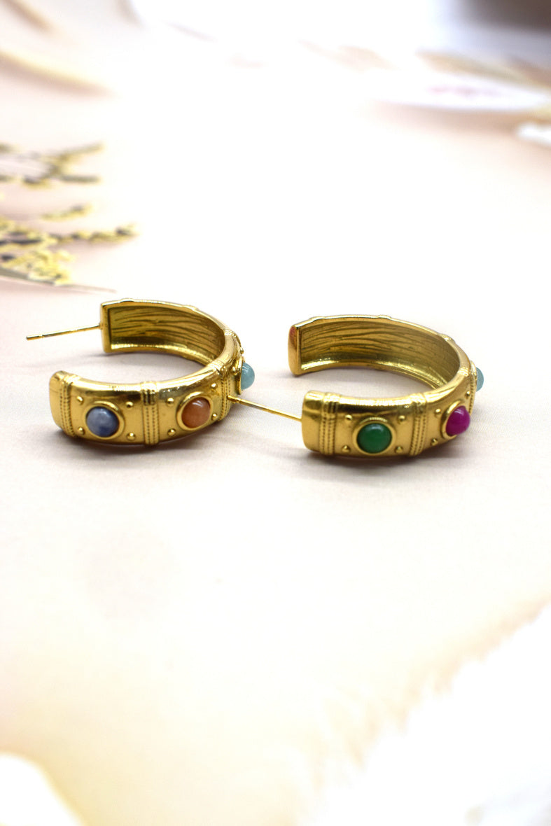 Les Boucles d'Oreilles Redowa, un modèle qui ne laisse pas indifférent. Une créole ouverte (2,5cm de diamètre), anneau assez large orné de pierres naturelles de couleur pour un côté bohème qu’on
