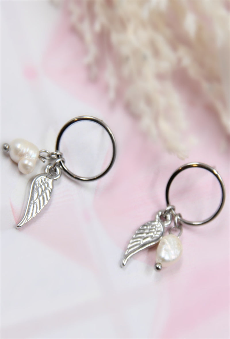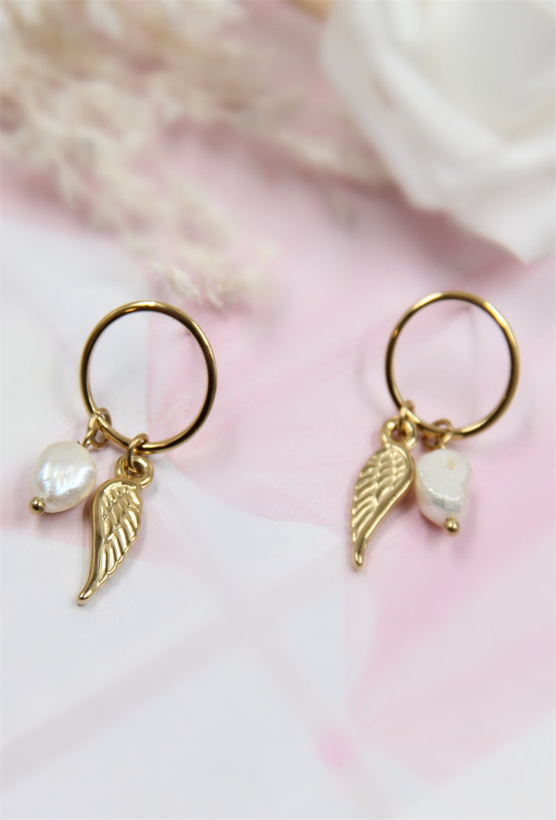 De la douceur et de l'originalité pour ce modèle Gabrielle. Un petit anneau de 1,3cm de diamètre orné de deux pendentifs : une aile (longueur 1,4cm) et une pierre blanche forme brute (longueur 7mm). Ces boucles d'oreilles sont en acier inoxydable et vous sont proposées dorées ou argentées.