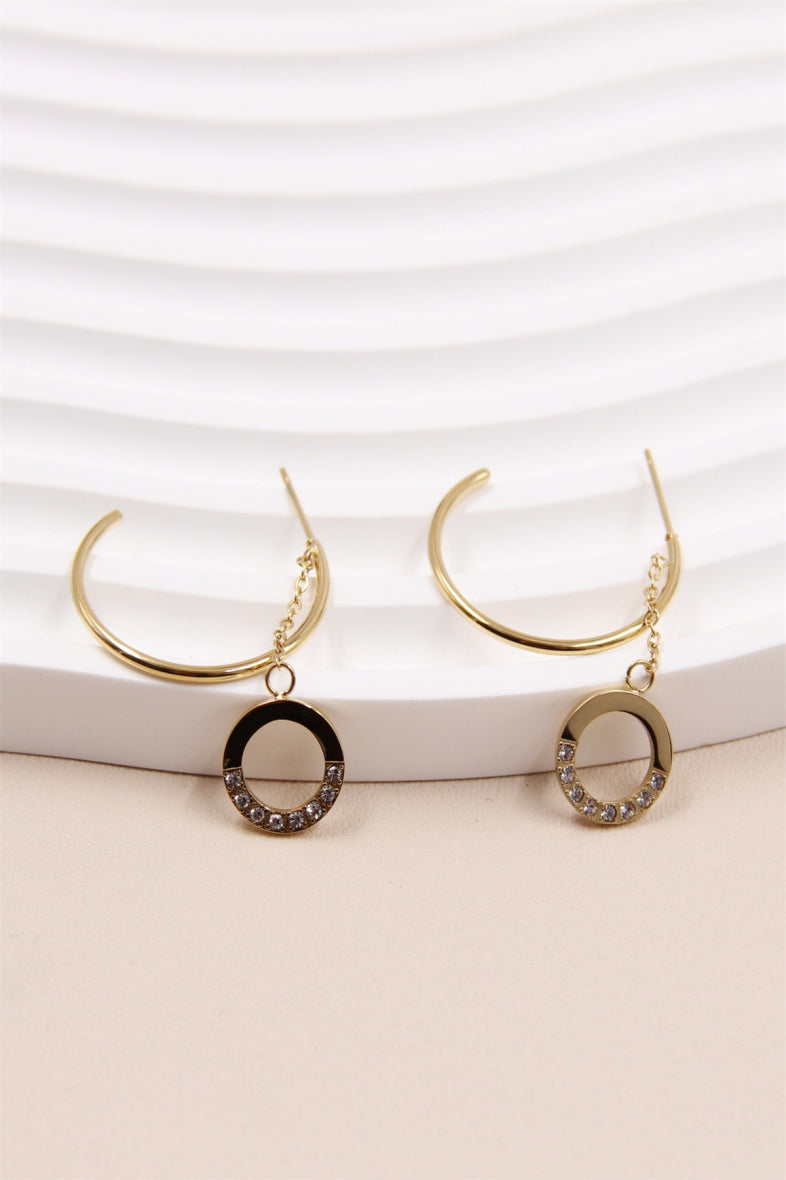 Les boucles d’oreilles Casino royal sont très élégantes. Un anneau moyen (2,4cm de diamètre), créole, ouvert, orné d’un cercle (1,2cm de diamètre) avec des strass, au bout d’une chaîne, longueur 2cm. C’est une pièce très originale et très marque. Ce modèle est en acier inoxydable doré.