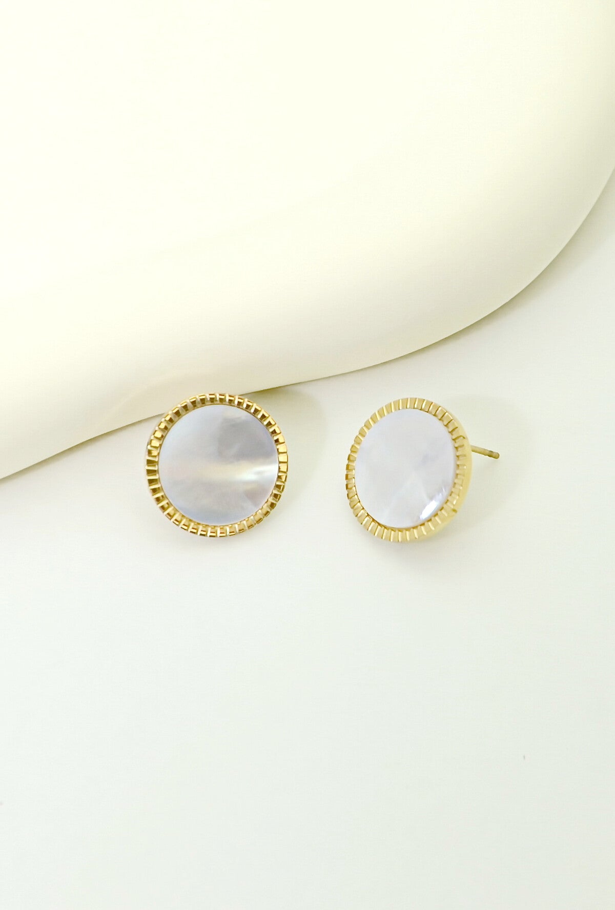 Les Boucles d’oreilles Naca, design rond minimaliste. Une nacre naturelle délicatement cerclée de métal doré.