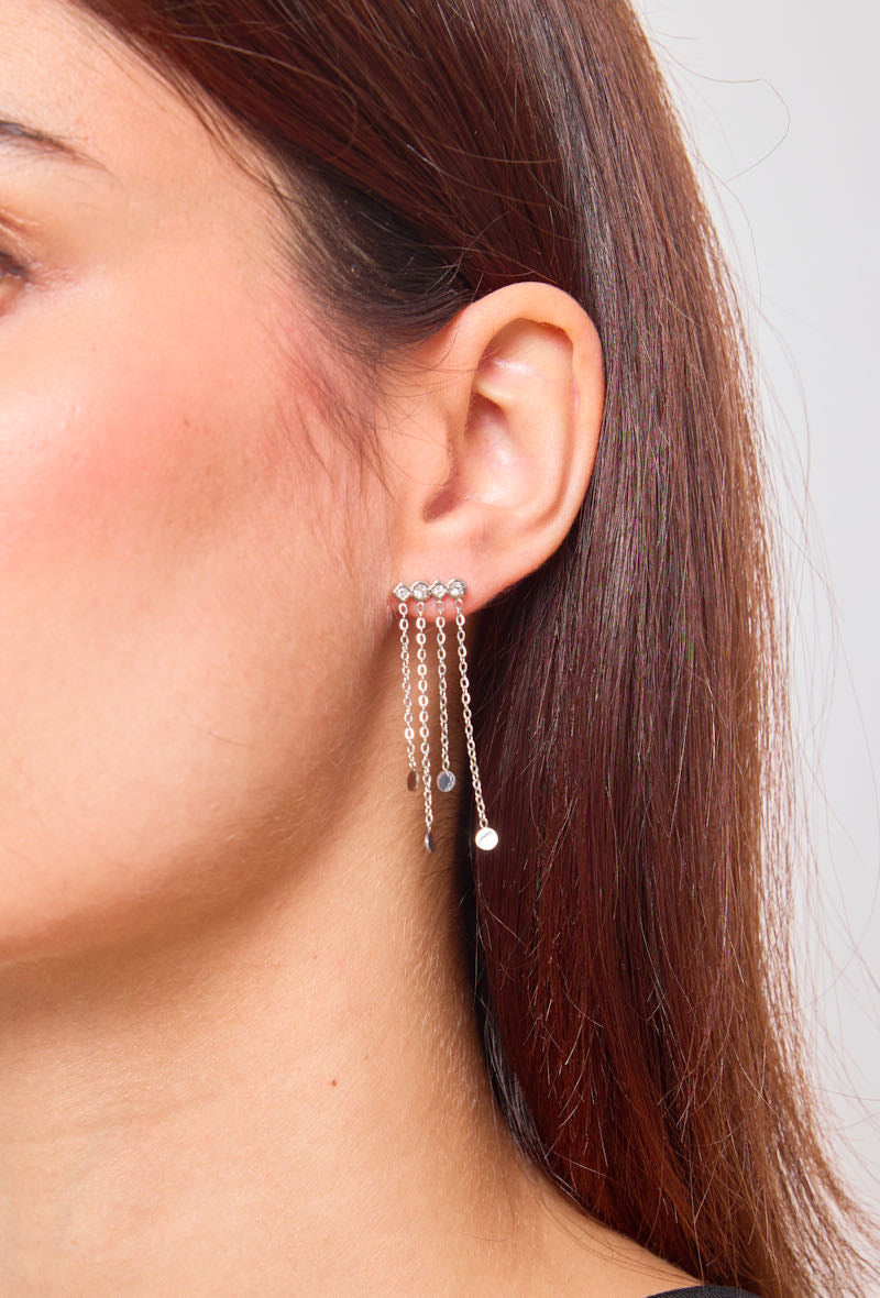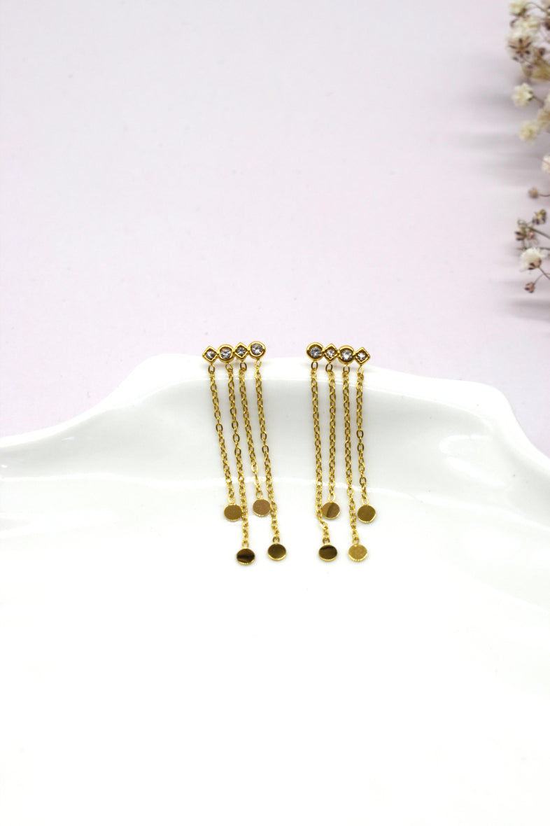 Les Boucles d’oreilles Piove sont très élégantes avec 4 chaînes pendantes, une rangée de brillants sur l’oreille. Un effet gala raffiné à tous vos looks !!! Elles sont en acier inoxydable et vous sont proposées dorées.