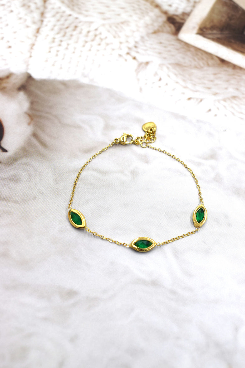 Le Bracelet Amanda est un modèle élégant ! Une chaîne fine ornée de 3 pierres vertes serties. Ce modèle est en acier inoxydable.