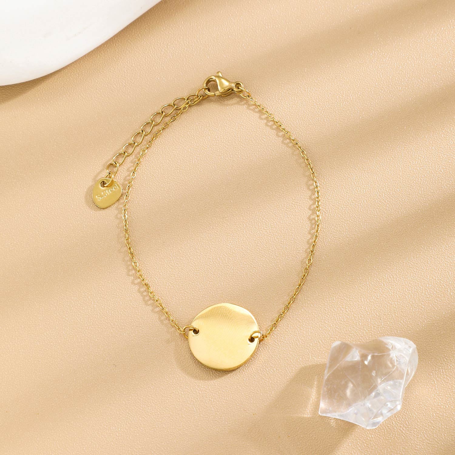 Le Bracelet Battista est un très joli modèle. Simple et dans la tendance. Une chaîne fine ornée d’un médaillon lisse et légèrement brut dans sa forme. Une touche délicate pour tous vos looks. Ce bijou est en acier inoxydable et vous est proposé doré.