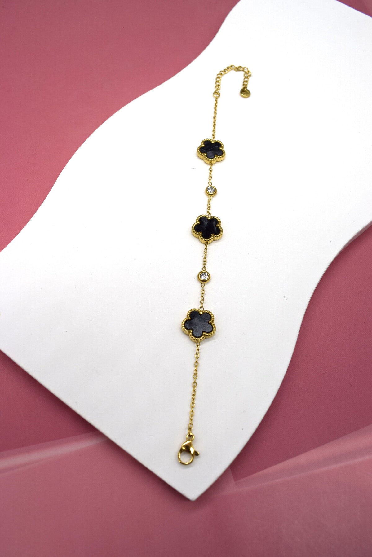 Le Bracelet Chance Strass est un modèle ultra tendance. Une chaîne fine ornée de trèfle en nacre et de strass confèrent à ce bracelet raffinement et douceur. Il vous est proposé en acier inoxydable doré, trèfles blancs ou noirs.