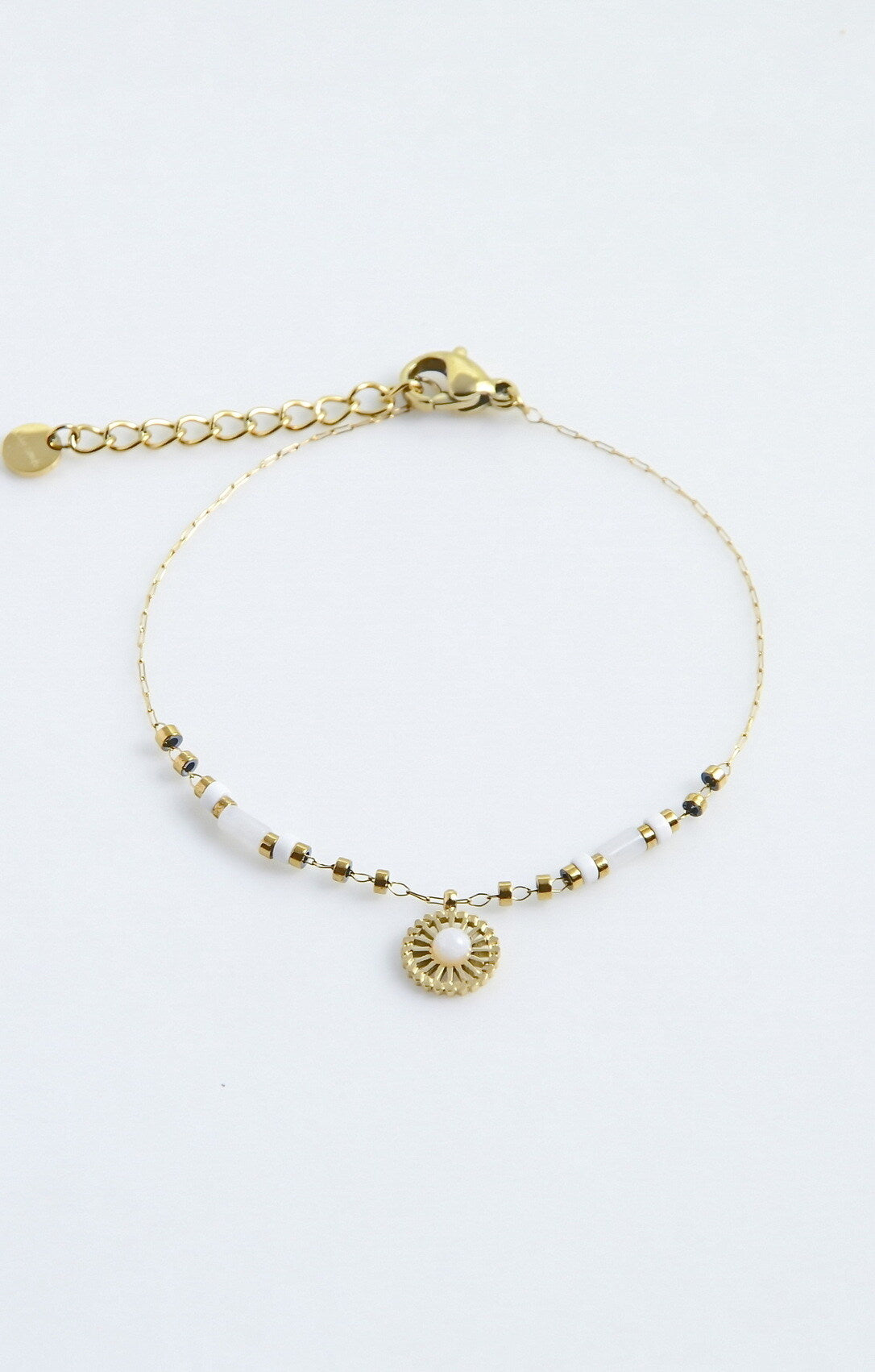 Bracelet fin en acier inoxydable, orné de perles géométriques en pierres naturelles blanches et d’un pendentif central délicatement texturé. Une pièce discrète et raffinée, parfaite en accumulation ou portée seule. Idéal pour compléter une parure ou offrir un accent élégant à votre poignet. Ce bijou est en acier inoxydable et pierres naturelles et vous est proposé doré.