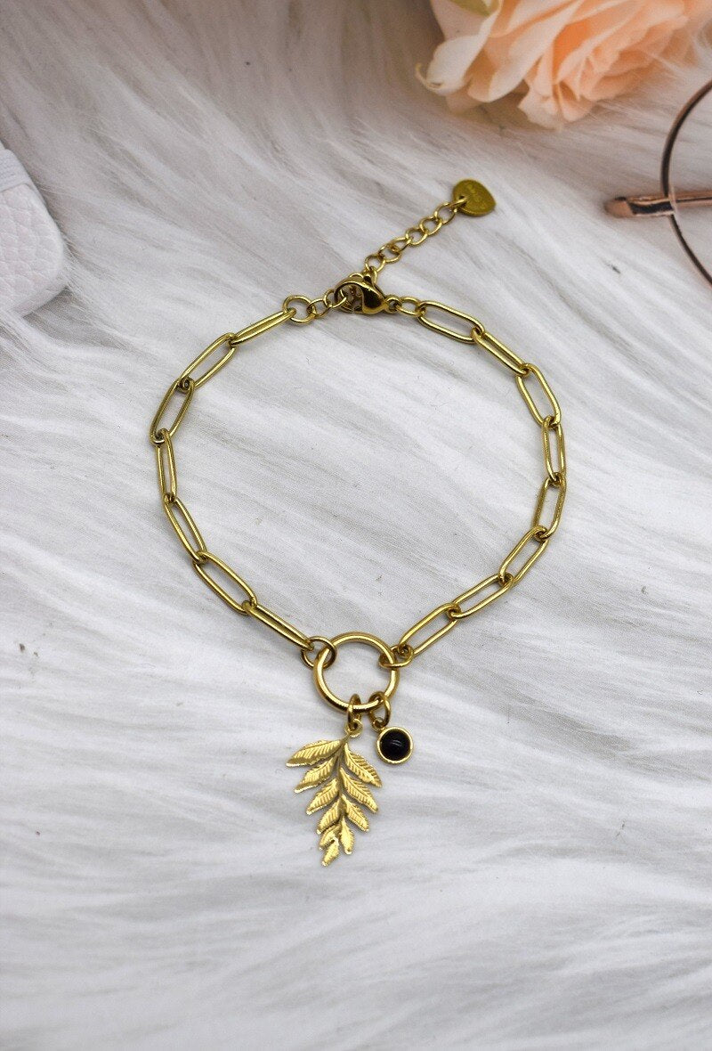 Le Bracelet Filetta est un modèle original, un pendentif feuille et une pampille perle noir en fond un modèle très tendance. Ce bijou est en acier inoxydable et vous est proposé doré.