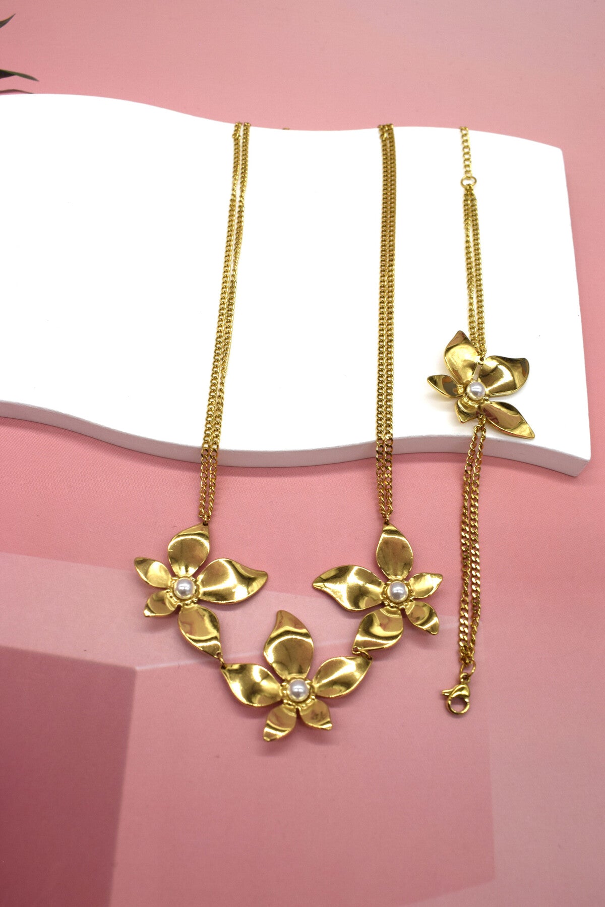 Le Bracelet Jasmin, un modèle élégant et ultra tendance. Une double chaîne reliée à une fleur ornée d’une perle blanche, aux pétales réalistes qui se posent délicatement sur votre poignet. Un bracelet avec beaucoup de personnalité et d’originalité. Il vous est proposé en acier inoxydable doré.