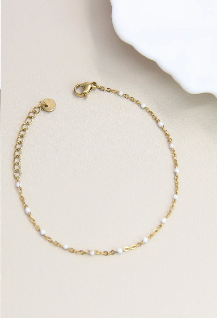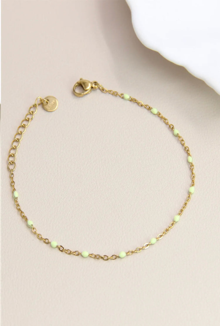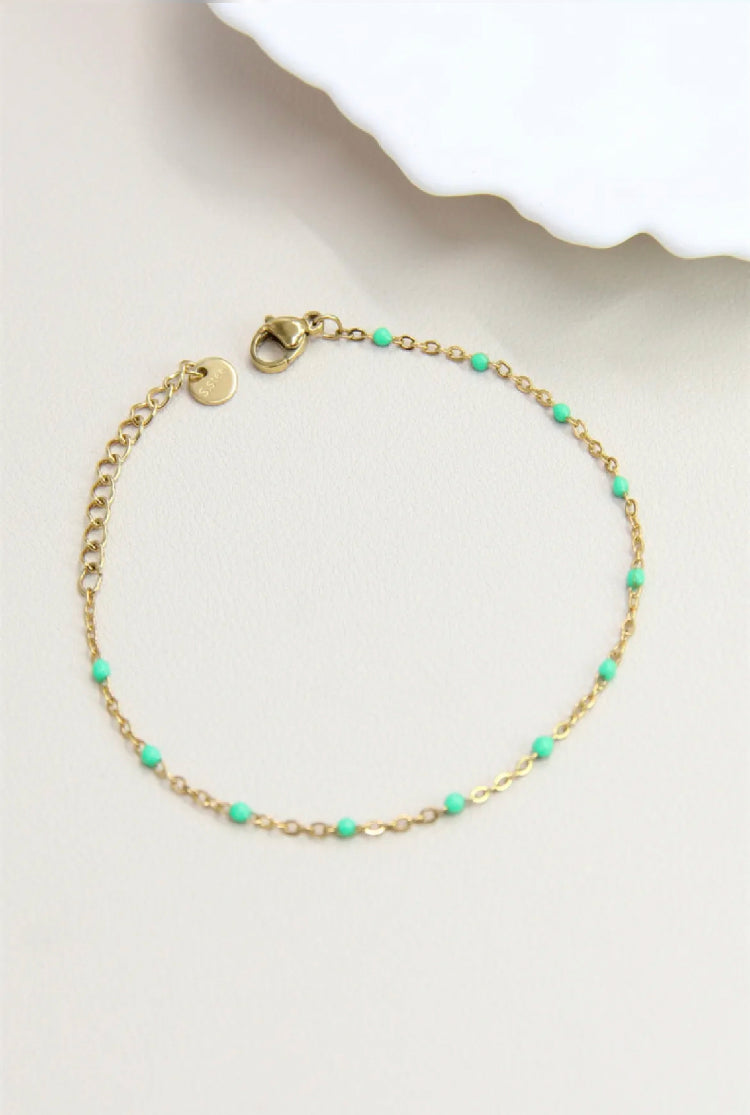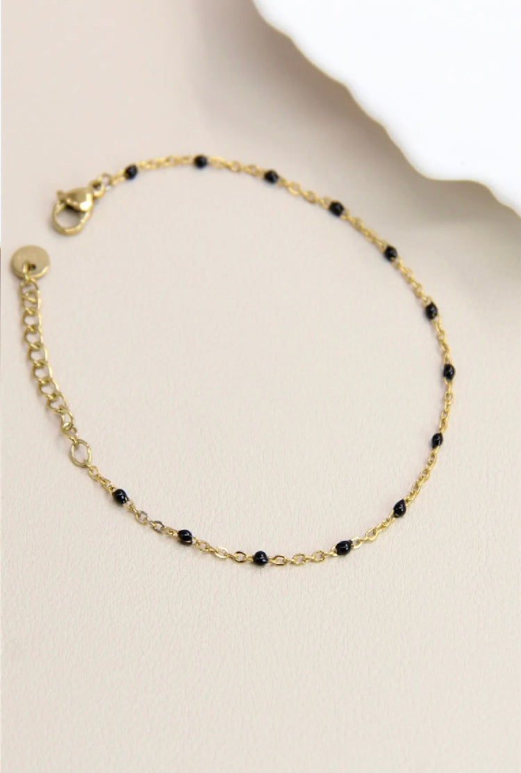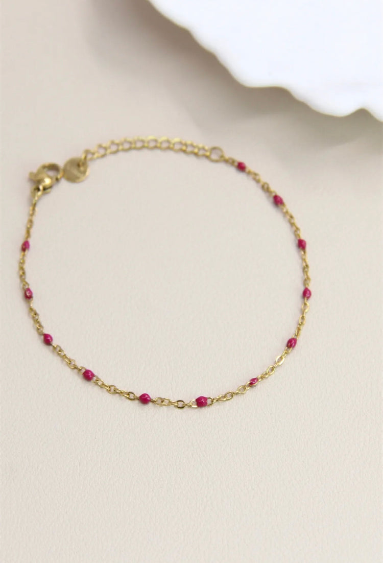Le bracelet l'Amoroso est un indémodable ! Il est passé de tendance à un essentiel de notre boîte à bijoux ! Style bracelet Gigi, une chaîne fine (longueur 20cm dont 4cm ajustable, ornée de petites perles ! de la couleur toujours de la couleur ! Ce modèle est vendu à l'unité bien sûr, il est en acier inoxydable doré. 11 couleurs différentes vous sont proposées.