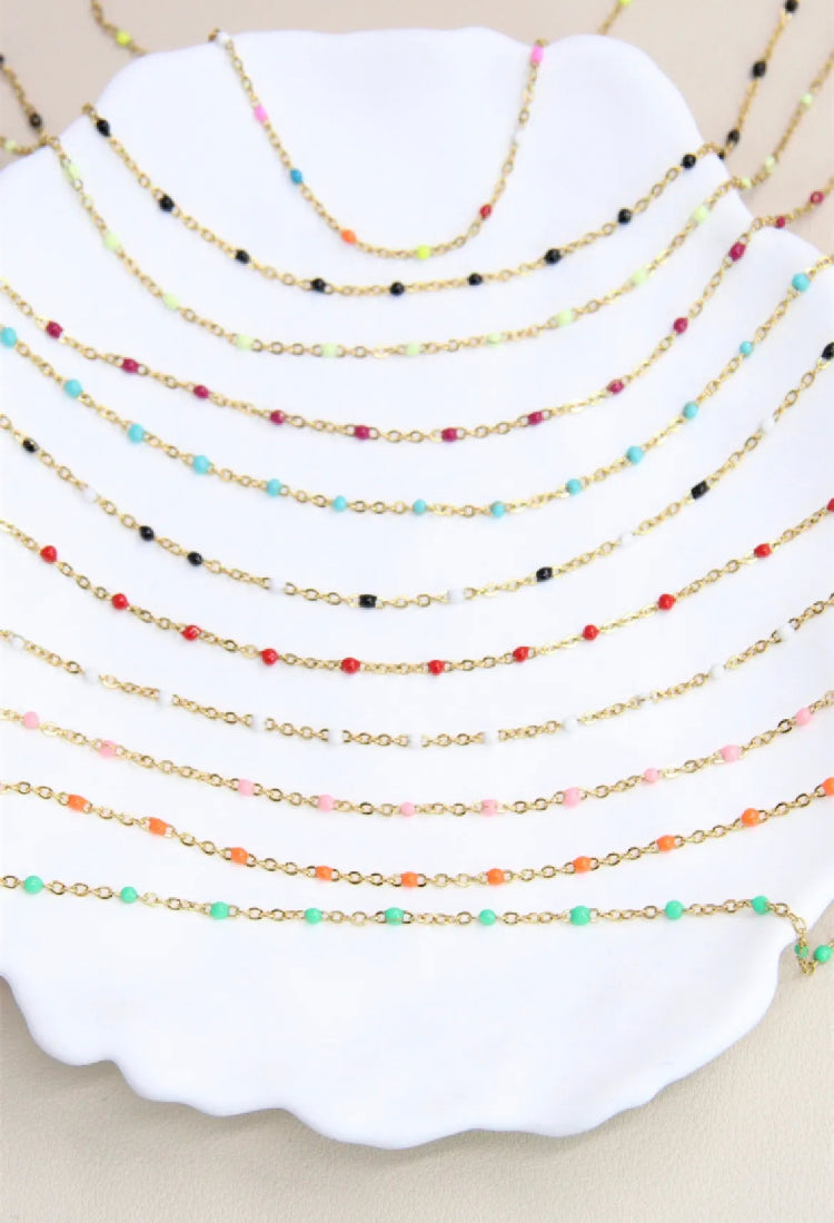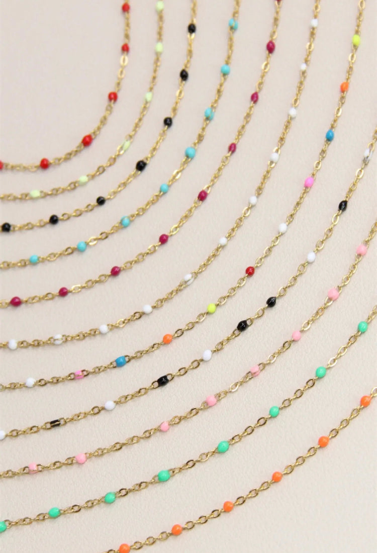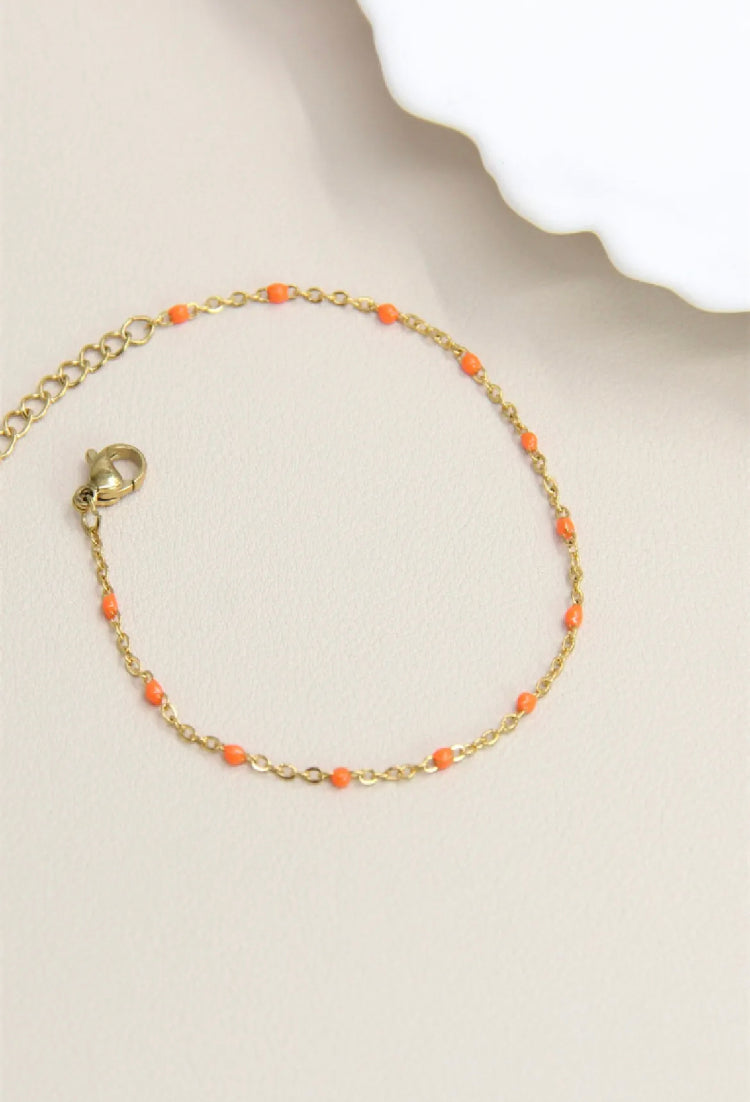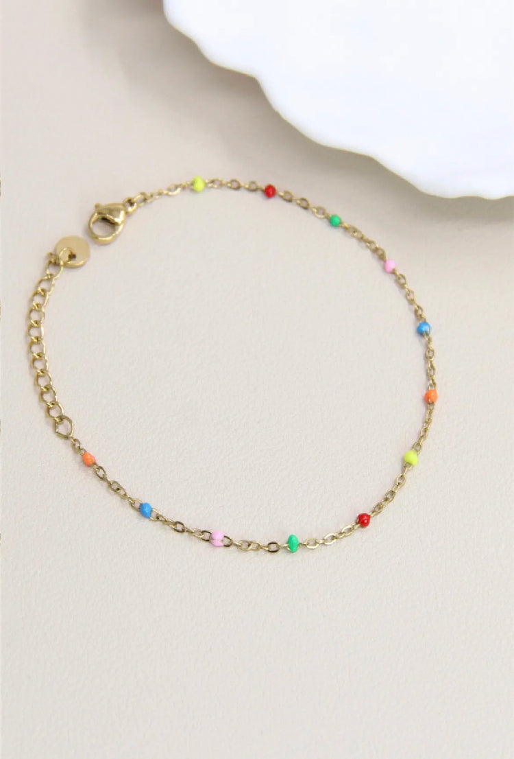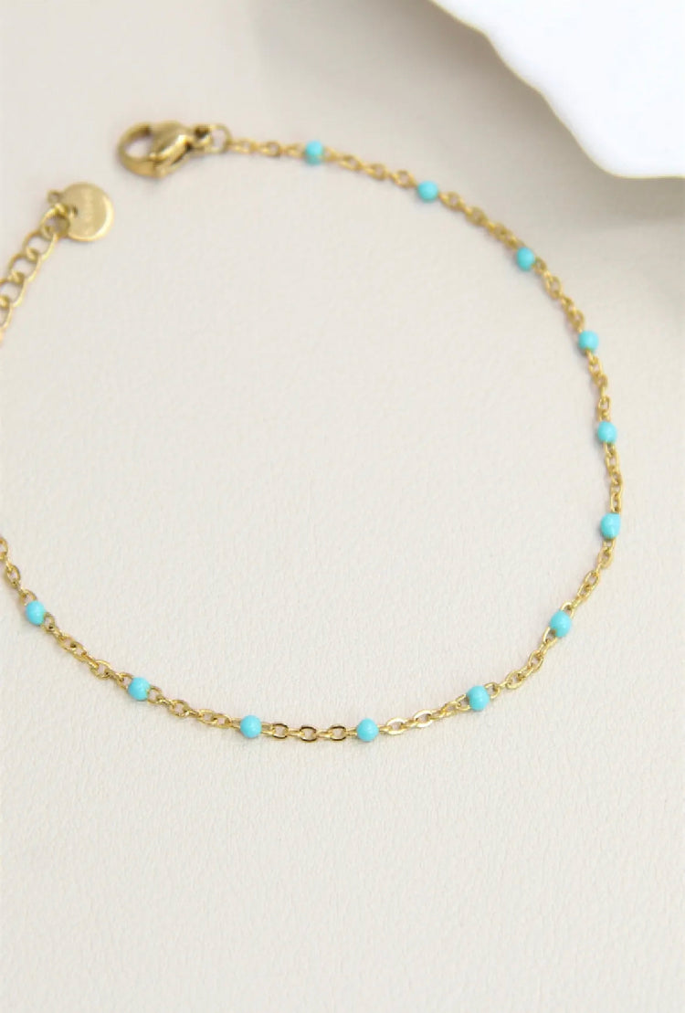 Le bracelet l'Amoroso est un indémodable ! Il est passé de tendance à un essentiel de notre boîte à bijoux ! Style bracelet Gigi, une chaîne fine (longueur 20cm dont 4cm ajustable, ornée de petites perles ! de la couleur toujours de la couleur ! Ce modèle est vendu à l'unité bien sûr, il est en acier inoxydable doré. 11 couleurs différentes vous sont proposées.