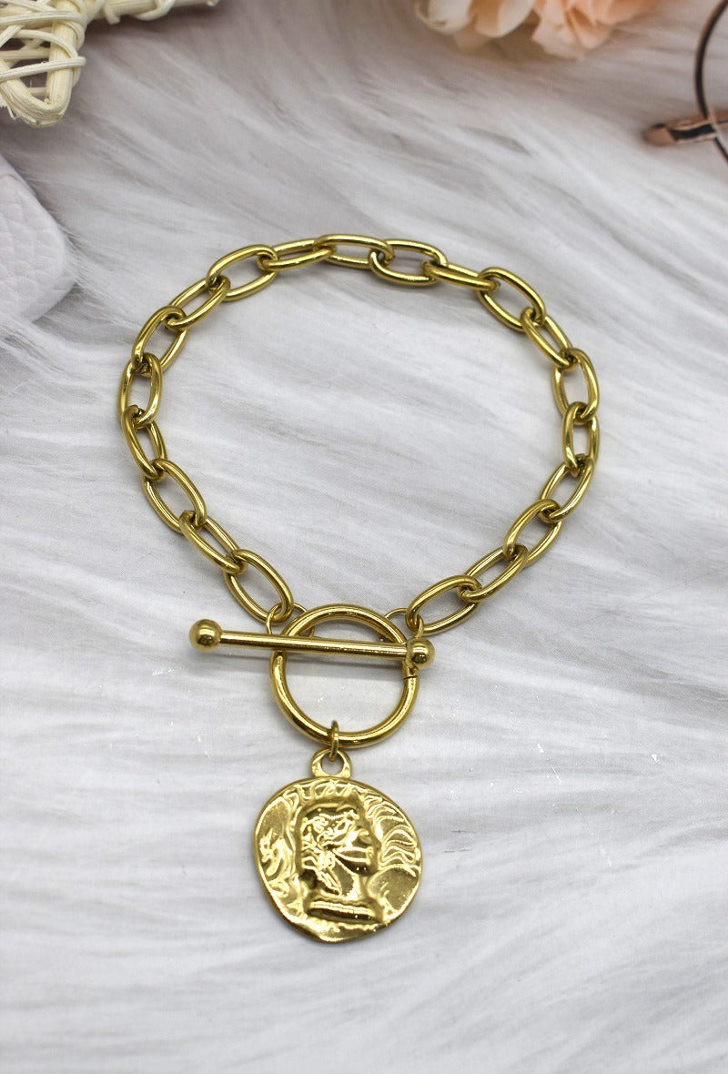 Le Bracelet Maravédis est un modèle aux allures rétro qu’on adore ! Un maillon moyen à gros, son fermoir à bascule et son pendentif ancienne pièce de monnaie sont piles dans la tendance. Un bracelet original et chiquissime. Ce bijou est en acier inoxydable et vous est proposé doré .