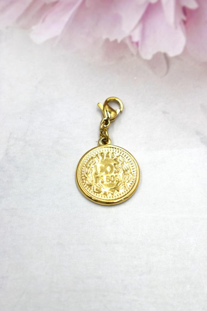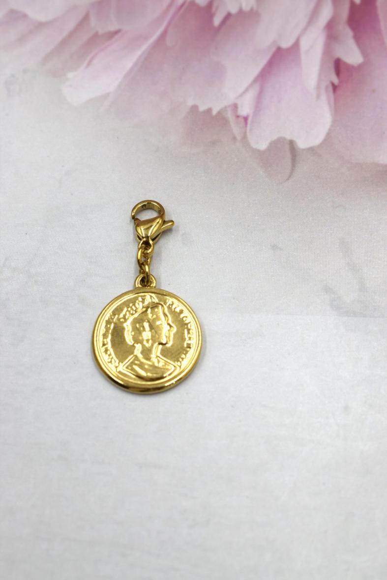 Le Charm’s Queen idéal pour un petit côté rétro dans la personnalisation de tous vos bijoux. Le médaillon représente une tête royale. Ce pendentif est en acier inoxydable et vous est proposé doré.