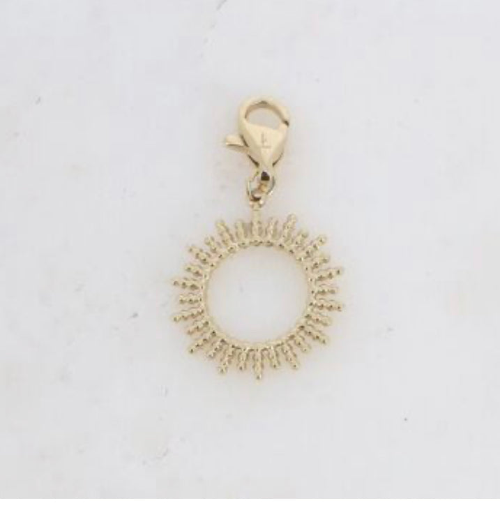 Le Charm Soleil, un soleil ajouré (1,5 de diamètre) accroché à vos bijoux ! Très joli porté ! Un vrai plus ! Ce modèle est en acier inoxydable doré.