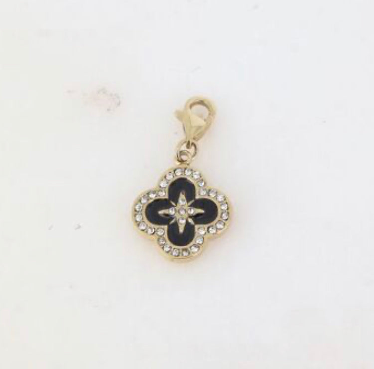 Le Charm Trèfle noir, c’est un trèfle de couleur noir entouré de strass avec en son centre une étoile ornée elle aussi de strass ! un modèle qui rehausse et apporte beaucoup d’élégance à tous vos bracelets ou vos colliers ! Ce charm est en acier inoxydable doré. dimension du charm 1,5cm x 1,5cm.