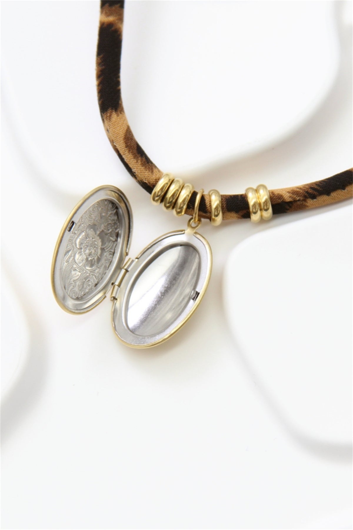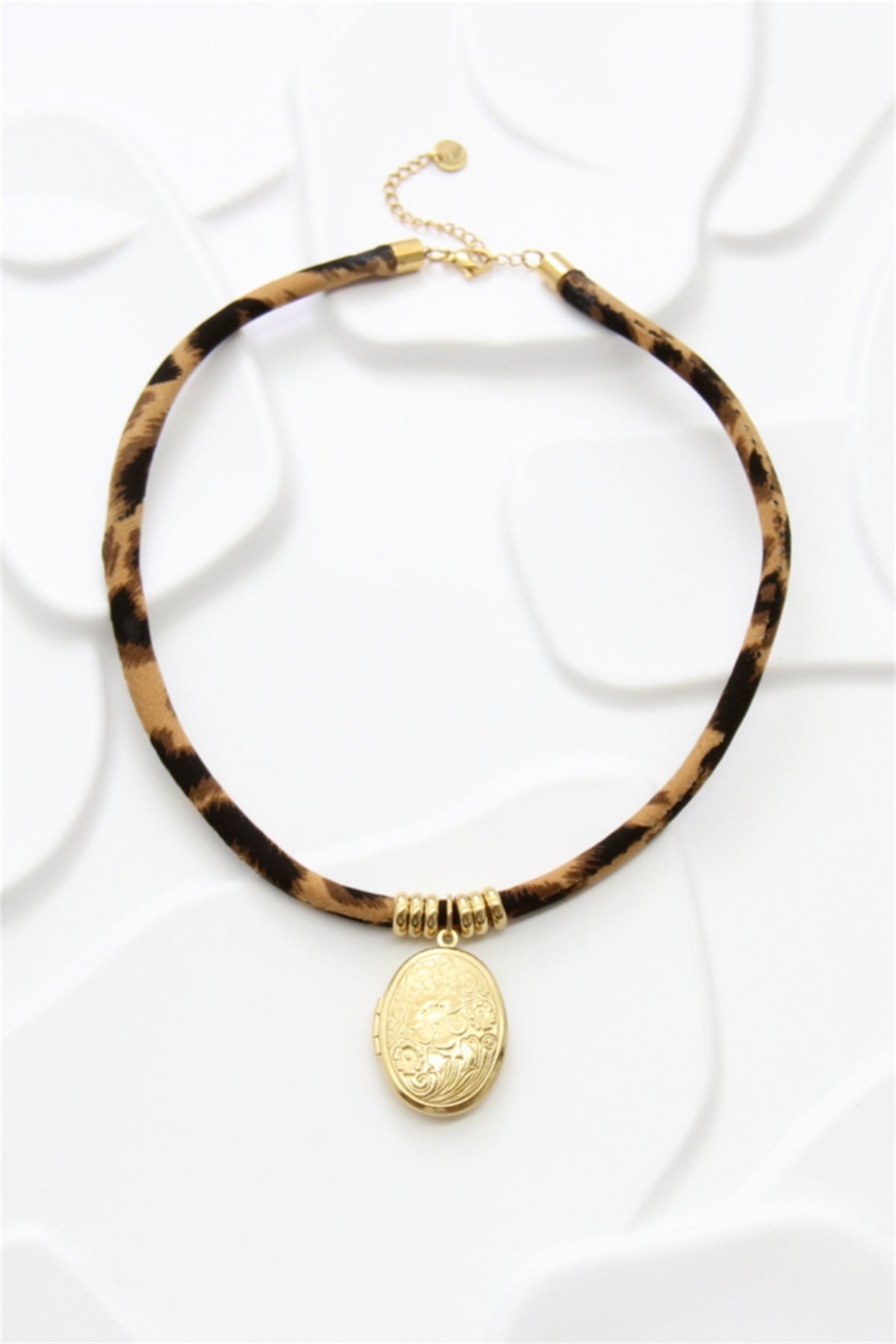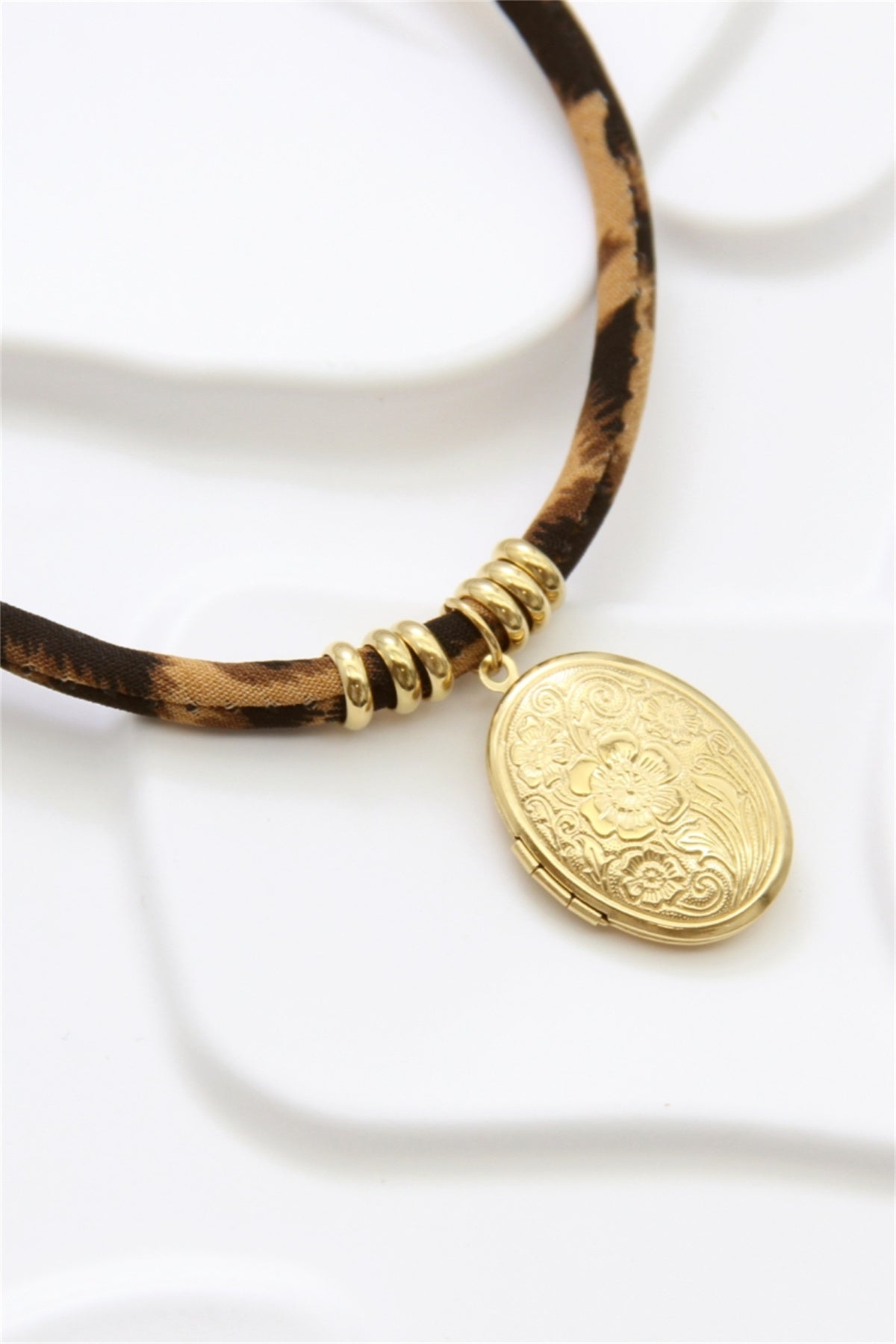 Le collier Saga Cordon léopard est ultra tendance. Apportez une touche d’élégance intemporelle avec ce collier pendentif médaillon ovale. Son pendentif doré délicatement gravé de motifs floraux renferme un compartiment secret qui s’ouvre, idéal pour y glisser une petite photo ou un souvenir précieux.