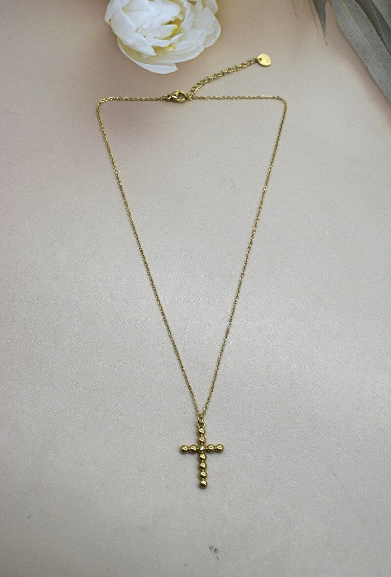 Le collier Myrrhe est une chaîne fine ornée d’un très joli pendentif croix avec un strass en son centre. Une pièce intemporelle qui habille votre quotidien ! Ce modèle est en acier inoxydable et vous est proposé doré.