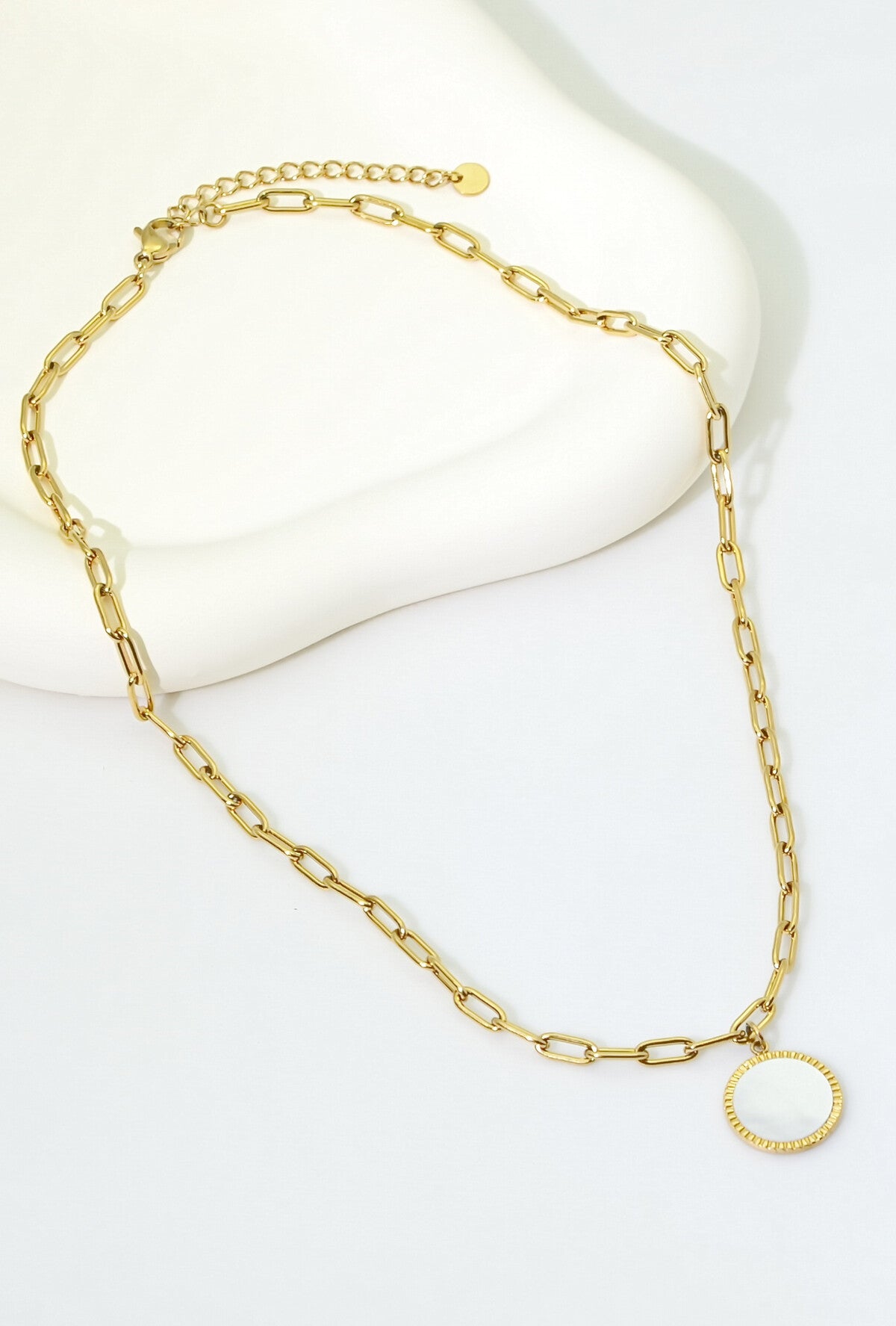 Le Collier Naca est un modèle très tendance, Chaîne à larges maillons et pendentif rond en nacre naturelle . Une pièce lumineuse et intemporelle à porter au quotidien.Ce bijou est en acier inoxydable, vous est proposé doré . .