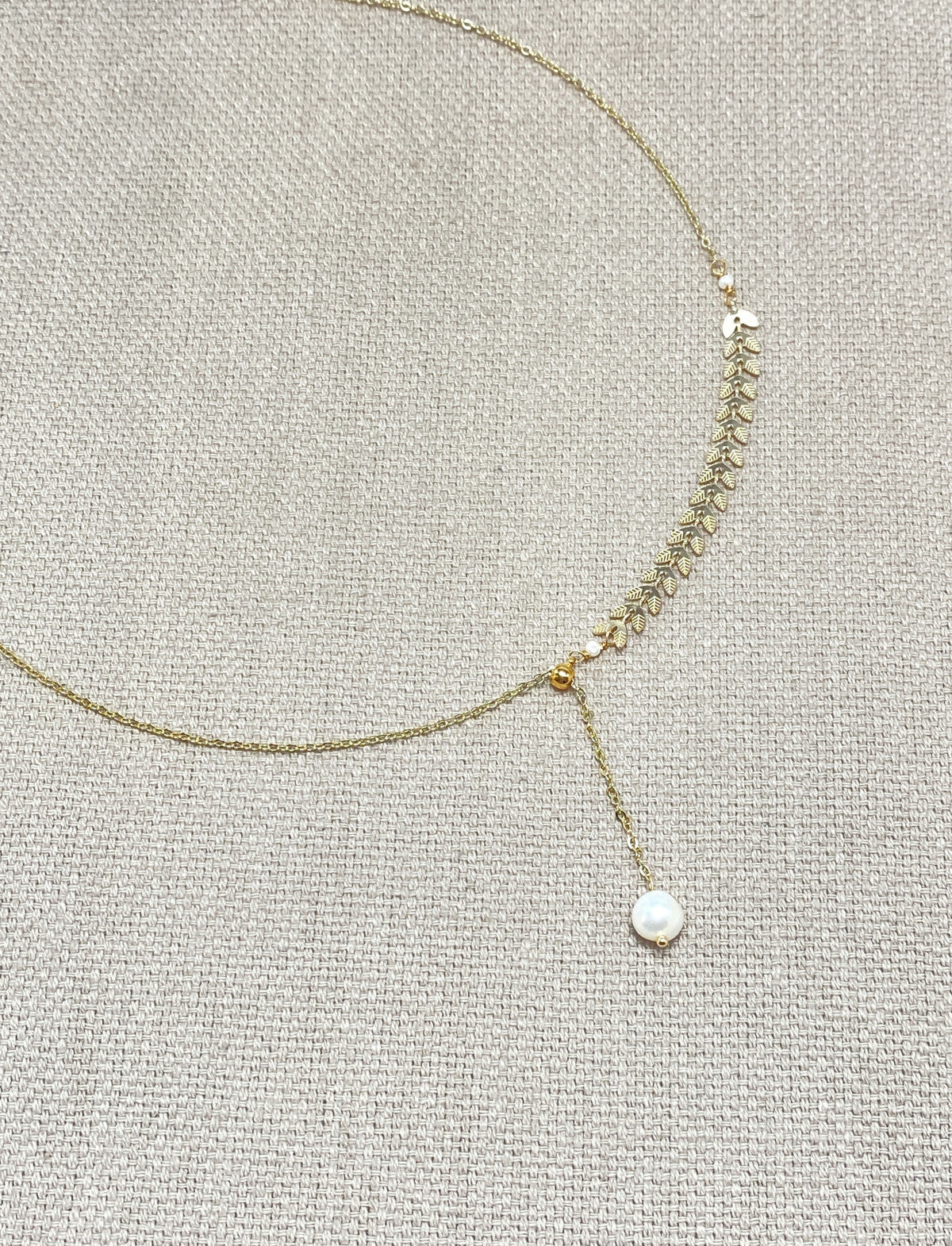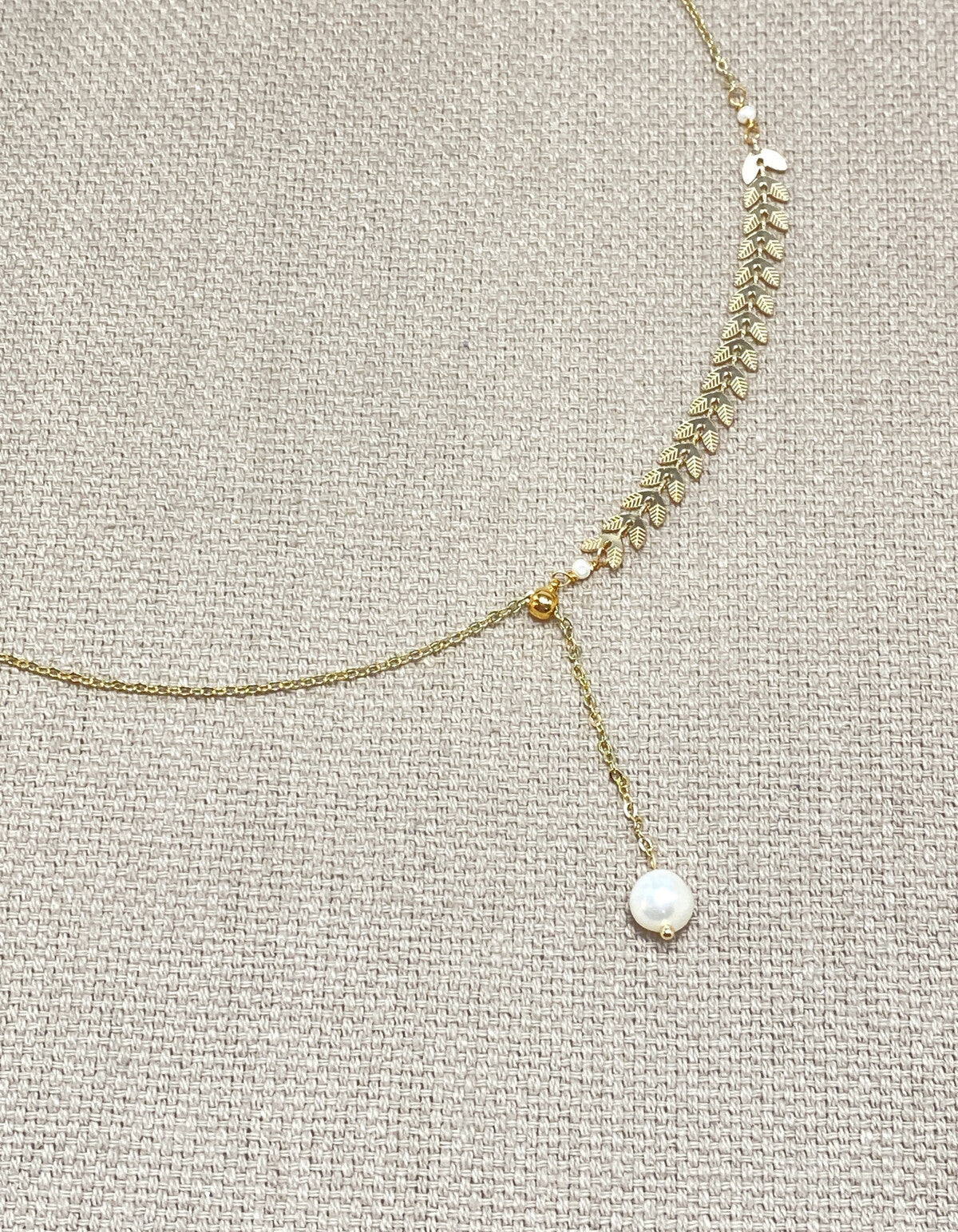 Le collier Y Natura est une chaîne fine, 7cm de cette chaîne est en forme de feuilles, cette partie est délimitée par 2 petites perles d’eau douce . La chaîne descendante se termine par une perle d’eau douce de taille moyenne. Le collier Y est pile dans la tendance, à vous de choisir celui fait pour vous ! Ce modèle est en acier inoxydable et vous est proposé doré.