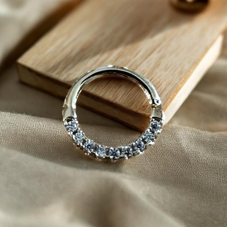 Le modèle Aragone Strass est un anneaux en acier chirurgical 316 L doré et oxydes de zirconium. Cet un piercing multi-usage : l'oreille (helix, snug, daith, conch) ou le nez (narine, septum). Vendu à l’unité